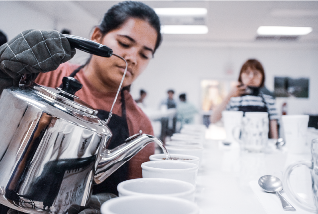 A cupping assistant pours hot water into vessels. Credit: Marco Beverage Systems